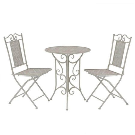 This vintage bistro set will add a classic touch to any dinner. Our steel balcony set will become the focal point of your garden, balcony or patio. The bistro set is made of powder-coated steel, which is weather-resistant and highly durable. The fancy hand-painted decorations and the rusted finish will make the dining set stand out in any garden or on any patio or balcony. The classic garden furniture set is very easy to clean with a damp cloth. The chairs can be easily folded to save space when not in use. Delivery includes 1 table and 2 folding chairs.