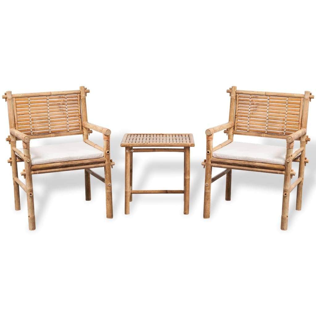This table and chair set will be the focal point of your living space. Made of weather-resistant and waterproof bamboo, the table and chair set is durable and stable. It is also easy to clean with a damp cloth. The included seat cushions add to its seating comfort. Delivery includes 1 table, 2 chairs and 2 seat cushions. Note: In order to extend the life of your outdoor furniture, we recommend you to clean it regularly and do not leave it outdoors without protection unnecessarily.Clean: Use a mild soap solutionStoring: If possible, store in a cool, dry place indoors. If the product is stored outdoors, protect it with a waterproof cover. Wipe and dry the excess water or snow from flat surfaces after a rain or snowfall. Allow sufficient air circulation to avoid moisture-related damage.