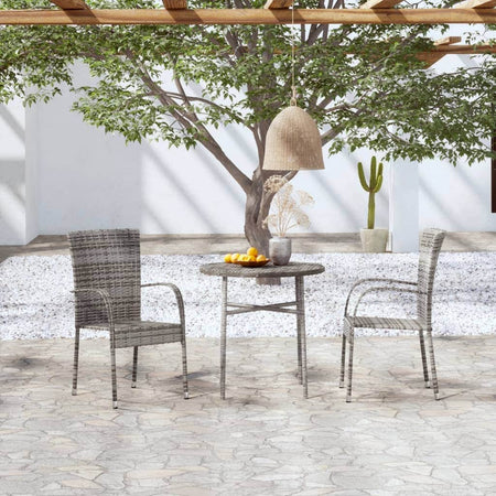Enjoy a nice meal or afternoon tea in your outdoor space with this poly rattan garden dining set! Featuring an elegant design, it will become the focal point of your garden and patio! The practical outdoor dining set has a powder-coated steel frame covered with PE rattan, making it hardwearing, easy to clean, and suitable for daily outdoor use. The table is excellent for keeping drinks and food within reach. The chairs are lightweight and can be stacked to save space when not in use. Note: In order to extend the life of your outdoor furniture, we recommend you to clean it regularly and do not leave it outdoors without protection unnecessarily.Clean: Use a mild soap solution.Storing: If possible, store in a cool, dry place indoors. If the product is stored outdoors, protect it with a waterproof cover. Wipe and dry the excess water or snow from flat surfaces after a rain or snowfall. Allow sufficient air circulation to avoid moisture-related damage.