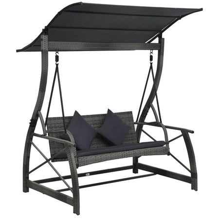 Whenever you feel like spending some relaxing time on the patio or in the garden, this outdoor swing bench with canopy would be a perfect retreat! This 3-seater porch swing exudes a appealing charm with a classic look that never goes out of style. Made of weather-resistant PE rattan, this swing chair is easy to clean, hard-wearing and suitable for daily use. The powder-coated steel frame makes the seat very sturdy and durable and easy to move around. You can sink into full relaxation with the included thickly padded seat and back cushions. The cushion covers are removable for easy cleaning. In addition, this swing provides maximum sunshade with the large textilene roof. You will enjoy swaying on this chair in soothing sunshine and gentle breeze. The swing bench is easy to assemble.