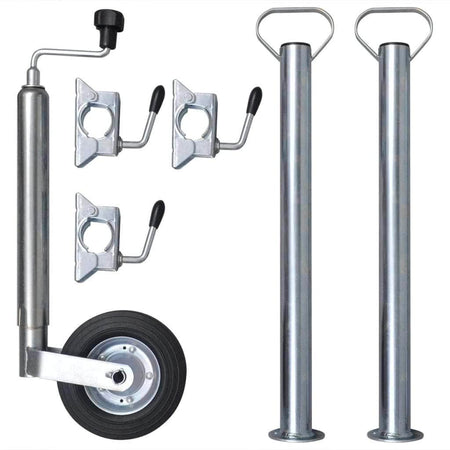 A jockey wheel is indispensible for conveniently coupling and uncoupling your trailer. If you're looking to equip your trailer with one, this jockey wheel will be a great choice. Made of high-quality galvanised steel, this jockey wheel is rust-resistant and robust with a maximum load bearing capacity of 150 kg, which makes it suitable for use with small to medium trailers and caravans. This jockey wheel can be adjusted to a maximum height of 75 cm and a minimum of 53 cm, more than enough to help detach couplings or lower them onto most tow balls. The 200 mm solid rubber wheel helps to easily move around your trailer when the jockey wheel is attached. Delivery also includes 2 solid support tubes and 3 split clamps.