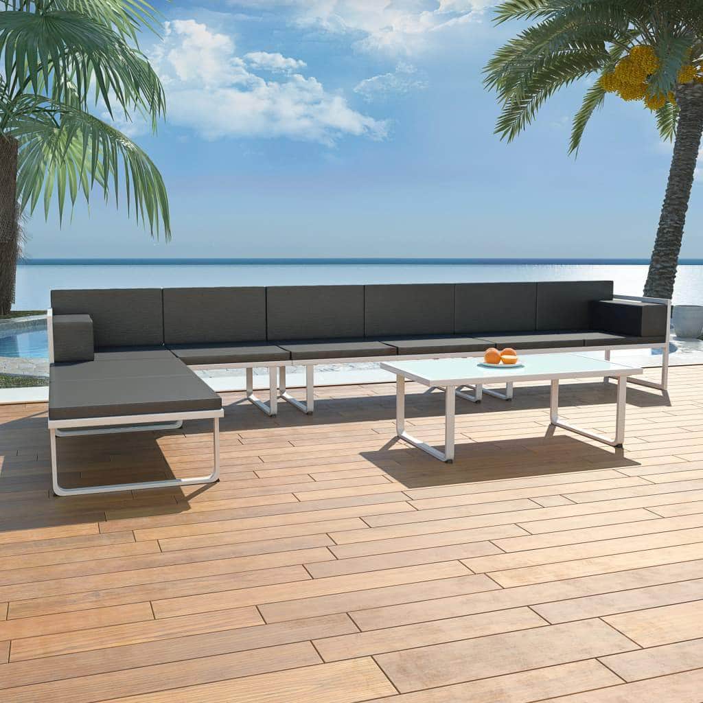This high-quality outdoor sofa set combines style and functionality and will become the focal point of your garden or patio. The whole furniture set is designed to be used outdoors year-round. Thanks to the 100% aluminium frame, the sofa set is easy to clean, hard-wearing and suitable for daily use. The seats are made of textilene, which is comfortable and weather resistant. The thick, removable seat cushions, back cushions and armrest cushions are comfortable and washable. Delivery includes two 2-seater sofas (left and right), 1 armless sofa, 1 ottoman, 1 coffee table with a 5 mm thick glass tabletop, 4 seat cushions, 6 back cushions and 2 armrest cushions. Note: We recommend covering the set in the rain, snow and frost.