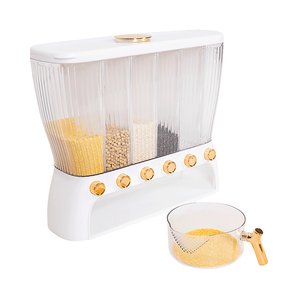 Introducing our innovative 6-compartment storage container, designed to streamline your kitchen organization. With a generous dry food capacity of 26L, this container accommodates six distinct dry food items, ensuring a tidy culinary space. The airtight feature of the grain containers serves as a safeguard against moisture, preserving the integrity of your rice grains and ensuring their long-lasting freshness. Experience the convenience of healthy and efficient food storage.