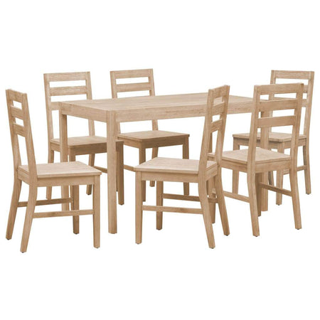 This 7-piece wooden dining set features an understated, timeless design and will add a touch of style to your interior. Made of solid acacia wood, the dining table and chairs are exceedingly stable and durable. Additionally, the backrests of the chairs add to seating comfort. This dining set is easy to clean with just a damp cloth. All table and chairs are easy to assemble. Delivery includes 1 table and 6 chairs.