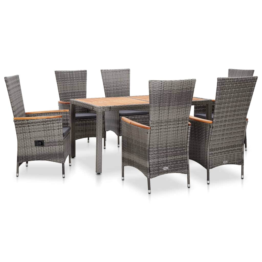 Our stylish poly rattan garden furniture set will become the focal point of your garden or patio! This rattan dining set has an elegant, contemporary design and will be a great choice for al fresco dining or relaxing in the garden. Made of weather- and water-resistant PE rattan, the dining set is easy to clean, hard-wearing and suitable for daily use. The powder-coated steel frames make the table and chairs strong and sturdy. The tabletop and the armrests are made of acacia wood, a tropical hard wood, which will bring a rustic charm. 2 of the 6 chairs are reclining chairs thanks to the adjustable back. By touching the button on the side, the backrest will recline. Thanks to their lightweight construction, all items are easy to move. The thick, soft, foam-filled seat cushions are highly comfortable and made of water-repellent polyester. The cushion covers with zips can be easily removed and washed. Note: We recommend covering the set in the rain, snow and frost.