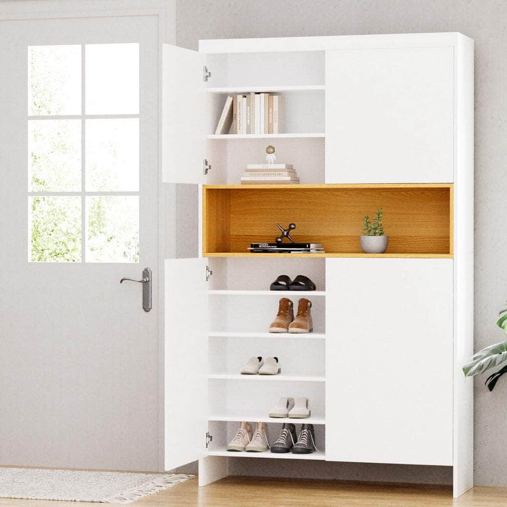 Organise your footwear in style with the 9-Tier Shoe Cabinet. Featuring a sleek push-to-open design, this cabinet combines practicality with modern aesthetics. The open middle shelf offers quick access to frequently used items, while the adjustable shelves provide versatile storage for shoes of various sizes. Crafted from durable particle board with a paper veneer, this cabinet is built to last.