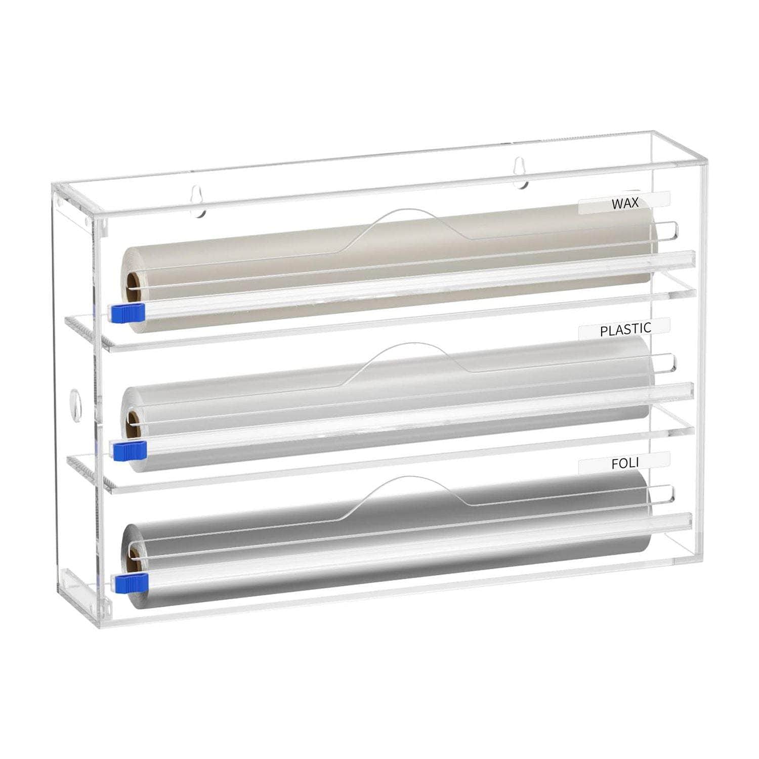 This Gominimo 3-in-1 Acrylic Wrap Dispenser comes with a built-in slide cutter and sets of labels/stickers so you don't have to worry about labeling their uses. The item is wall-mounted, giving you more space on your kitchen tops for other items and appliances.