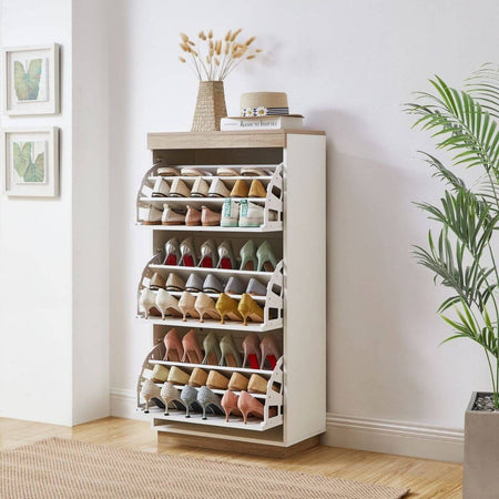 Featuring 2 shoe tiers per storage drawer, this Chic Coastal inspired shoe cabinet stores upto 27 Pairs!