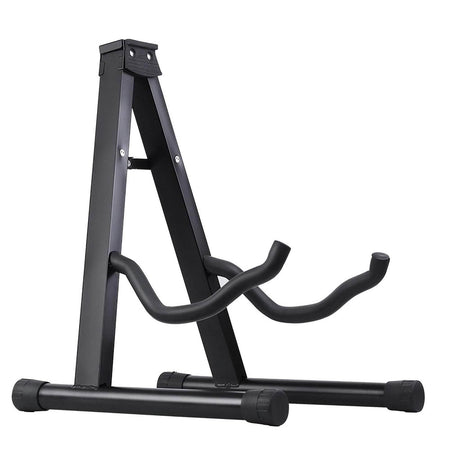 Our Guitar Stand provides a perfect support for your acoustic, electric or bass guitar. Made of powder-coated steel, the triangular design stand is ultra firm and stable. The holders are padded to protect your instrument and provide a gentle base for it to rest on. It also comes with anti-slip rubber feet to ensure a firm grip on the ground. And the guitar stand folds flat for easy storage or carry to any venue or gig. Not least, the guitar stand comes with a bonus capo and set of guitar strings.
