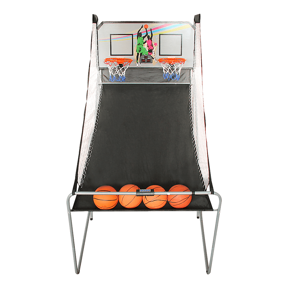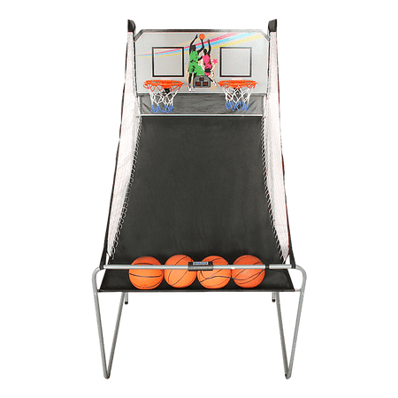 This Arcade Basketball Game is a perfect game for the entire family. It's designed for one or two players and allows you to choose from eight different game play options. The frame is constructed of sturdy 7/8-inch diameter metal with durable 12-inch diameter steel rims and braces to provide stability during active play. The LED scoring system keeps track of score and time and also has integrated arcade sound effects for an authentic stadium experience. After playing, it can be folded quickly and easily for storage. All accessories are included.