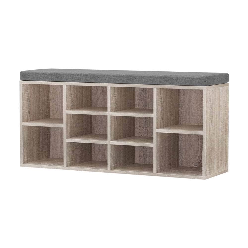 Practical and stylish. Our Shoe Shelf Bench blends two functions into one elegant piece. The shoe shelf features 10 compartments to fit up to 10 pairs of footwear of various shapes and sizes while the fabric bench offers a soft and comfortable rest with its 4cm thick detachable cushioned seat. The entire ensemble is made from particle board for strength and durability. Not least, the two-tone design adds an exquisite touch to this very pragmatic ensemble.