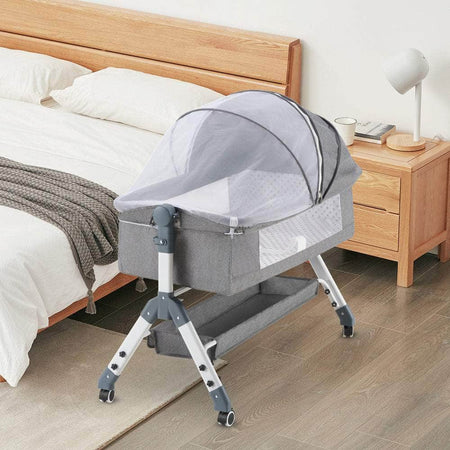 Busy new parents need a reliable baby cot that ensures their baby sleeps comfortably while offering convenience. Our Playpals baby cot serves as both a standalone crib, gently rocking to soothe your baby to sleep, and a bedside sleeper for easy nighttime care, allowing you to focus on those precious moments together. Our baby bassinet ensures your baby's health with a detachable canopy featuring mosquito netting to keep mosquitoes out, ensuring uninterrupted sleep. The firm mattress, filled with sponge and PVC hollow board, supports your baby's developing bones and muscles, reducing the risk of suffocation and SIDS. Additionally, our baby bed can be tilted 5 degrees to soothe indigestion and alleviate reflux, ensuring your baby's comfort throughout the night. The breathable mesh sides enhance airflow, promoting your baby's comfort and providing parents with a clear view for peace of mind.