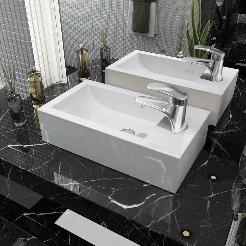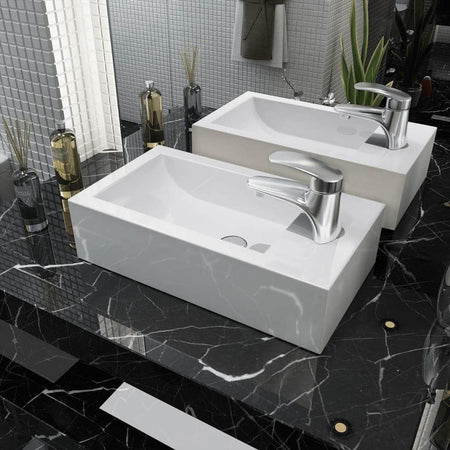 This rectangular wash basin, made of premium ceramic, will be a stylish addition to any bathroom, washroom or powder room. Its glazed surface brings itself a modern yet elegant design. This artistic ceramic basin is more than just a practical vessel for everyday use, but it is an adornment for your living space. It will definitely suit any interior style. In addition, the basin is quite easy to clean. A faucet hole of diameter 3.7-3.8 cm is included to install a tap. The drain hole is 4.5 cm in diameter. Please note that the tap and the drain are not included in delivery.
