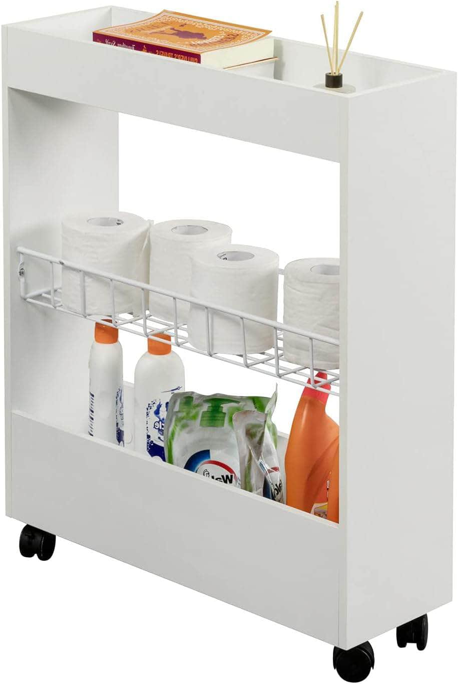 - This convenient storage solution offers plenty of space for all your items. Featuring two shelves and one metal grid basket, you'll have plenty of room for organizing and storing. Plus, the four wheels make it easy to move around, and two of them are equipped with brakes for added stability.