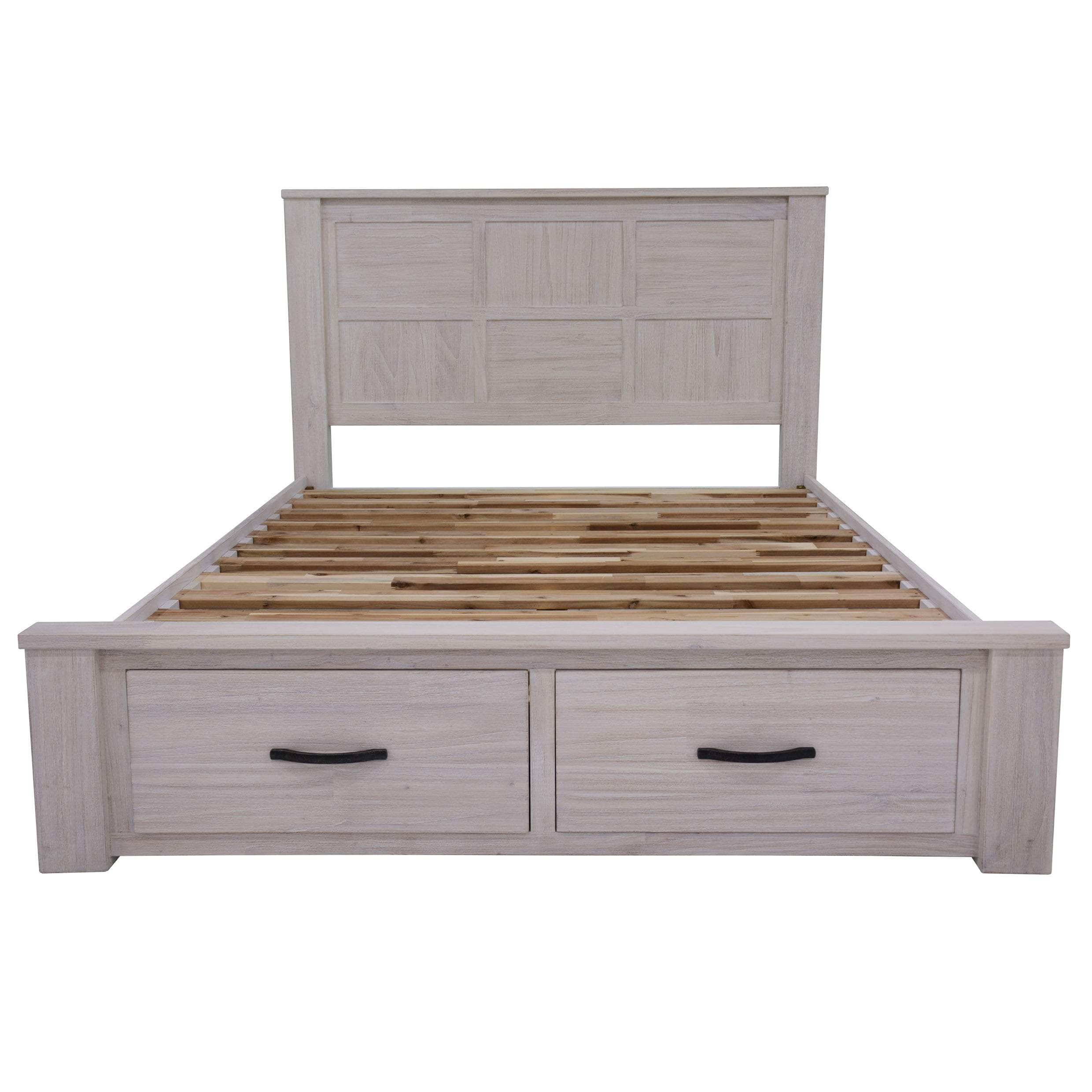 A bedroom is the place that gives the most comforting rest. Enjoy a restful night's sleep here with this double bed with storage, designed in the coastal style. The bed transforms your bedroom into a luxurious retreat where you can unwind in a relaxed manner. The magnificent furniture piece is made of mountain ash wood harvested in a sustainable way. The wood is known for attractive looks, great strength, shock-resistance, durability, and also easy maintenance. A distinctive panelled 'checker-board' headboard gives a classy look to the bed, and a solid wood slat system with central support legs gives it super robustness. The easy-to-assemble bed comes with 2 storage drawers to enhance the storage capacity of your bedroom. That means you can easily keep your bedroom clutter-free. The drawers are embellished with smooth metal extension runners and gleaming metal handles with an antiqued finish. The bed in Brushed White Wash finish goes well with a variety of interior decor styles. A one-year warranty is included with it.