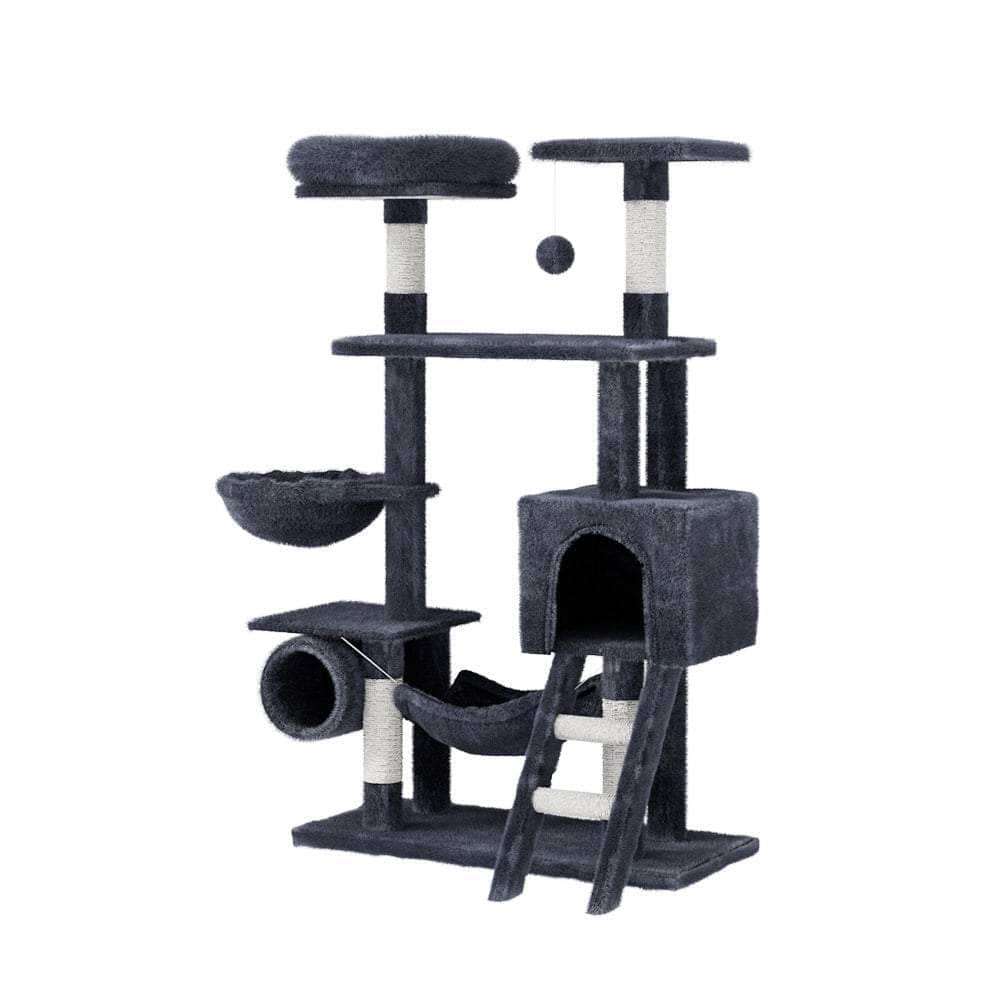 Built to satisfy the natural instincts of your precious pet, our Cat Tree includes a host of nooks and crannies for your cats to have hours of fun scratching, hunting, climbing, jumping, hopping or simply lounging around. Hanging balls also keep your cat curious and alert. Uses woven sisal twine towers so you can rest assured that your furniture will stay cat scratch free. Not least, the tree is upholstered with a plush scent- and chemical-free velvety surface for extra comfort and style. Best of all, the firm base and sturdy construction ensure that the tree remains a durable cat haven with total peace of mind for you. Can we hear a meow to that?