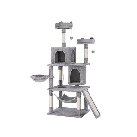 Built to satisfy the natural instincts of your precious pet, our Cat Tree includes a host of nooks and crannies for your cats to have hours of fun scratching, hunting, climbing, jumping, hopping or simply lounging around. The medium-sized cat tree is built on a stable base to prevent tipping and the sturdy wood construction is built to last through years of play. Natural sisal posts encourage your cats scratching instincts and help maintain healthy claws. The plush, soft linen cover will lull your cats to sleep in the plush bed platform, two sleeping cradles and two private bunny-shaped cubicles. A standing ball will keep your cat curious and alert. With multiple levels and access points your cats can jump, climb and observe the home on high. Keep your cat feline fine with an Cat Tree.