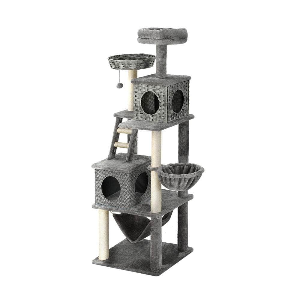 Built to satisfy the natural instincts of your precious pet, our Cat Tree includes a host of nooks and crannies for your cats to have hours of fun scratching, hunting, climbing, jumping, hopping or simply lounging around. The medium-sized cat tree is built on a stable base to prevent tipping and the sturdy wood construction is built to last through years of play. Natural sisal posts encourage your cats scratching instincts and help maintain healthy claws. The plush, soft linen cover will lull your cats to sleep in the plush bed platform, two sleeping cradles and two private bunny-shaped cubicles. A standing ball will keep your cat curious and alert. With multiple levels and access points your cats can jump, climb and observe the home on high. Keep your cat feline fine with an Cat Tree.
