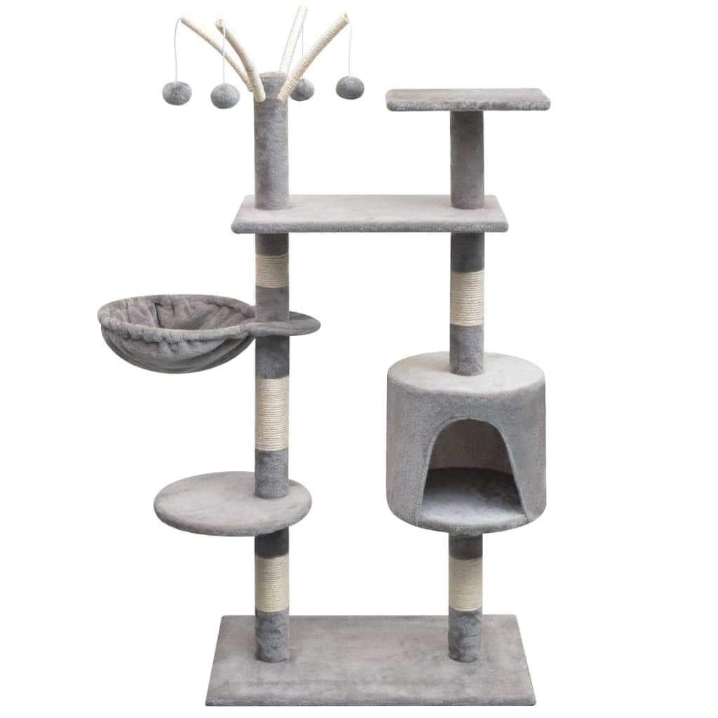 Give your feline friends a taste of luxury with our feature-packed cat tree! This multi-storey cats' play centre, with a solid frame covered in soft, comfortable plush, is the perfect retreat for your cats to scratch, climb, perch, hide, and rest. Your feline friends can sharpen their claws on the scratching posts wrapped in sisal rope, which provides a healthy outlet for their scratching instincts. They will also enjoy chasing after each other while jumping up and down this fun play centre. At the top of the cat tree, there are dangling toys that will engage your curious cats. When they've had enough playtime fun, your little friends will love resting on the upper platforms where they have a better view. They can also hide in the cosy house to take a nap, or take a load off on the comfy hammock. With all these fun features, this cat tree will become your furry friends' favourite hangout spot!