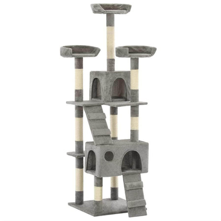 Give your feline friends a taste of luxury with our feature-packed cat tree! This multi-storey cats' play centre has a sturdy frame covered in soft, comfortable plush and will make the perfect retreat in which your cats can scratch, climb, perch, hide, and rest. Your feline friends can sharpen their claws on the scratching posts wrapped in sisal rope, which provides a healthy outlet for their scratching instincts. They will also enjoy chasing after each other while jumping up and down this fun play centre. When they've had enough playtime fun, your little friends will love resting on the upper platforms where they have a better view. They can also hide in the cosy houses to take a nap. With all these fun features, this cat playhouse will become your furry friends' favourite hangout spot! The cat tree is easy to assemble.
