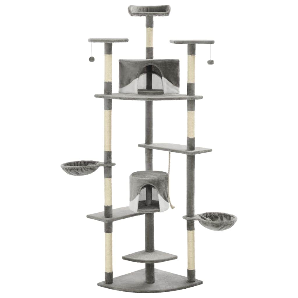 Give your feline friends a taste of luxury with our feature-packed cat tree! This multi-storey cats' play centre, with a solid frame covered in soft, comfortable plush, is the perfect retreat for your cats to scratch, climb, perch, hide, and rest. Your feline friends can sharpen their claws on the scratching posts wrapped in sisal rope, which provides a healthy outlet for their scratching instincts. They will also enjoy chasing after each other while jumping up and down this fun play centre. At the top of the cat tree, there are two dangling toys that will engage your curious cats. When they've had enough playtime fun, your little friends will love resting on the upper platforms where they have a better view. They can also hide in the cosy houses to take a nap, or take a load off on the comfy baskets. With all these fun features, this cat playhouse will become your furry friends' favourite hangout spot!