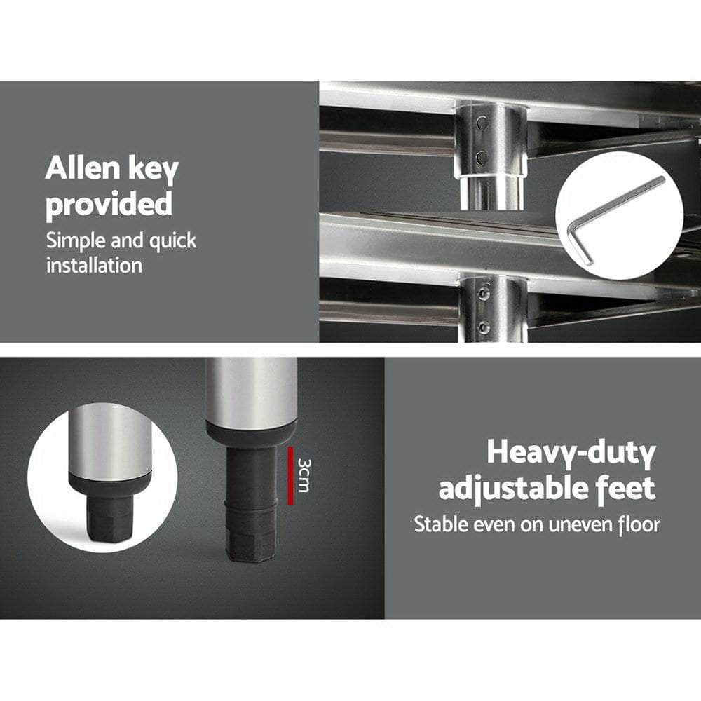 Our Stainless Steel Work Top is finished in commercial grade 430 stainless steel which makes it ideal for use in homes, cafes and restaurants. This bench, with much more space, is wider than the standard one in our stores.The treated bench edges provide extra safety working around the table while the adjustable bottom shelf allows you more height options for storage. Everything is held together firmly with the help of the included allen key for quick and easy installation. And if the floor is uneven, the adjustable legs can make things right with ease.