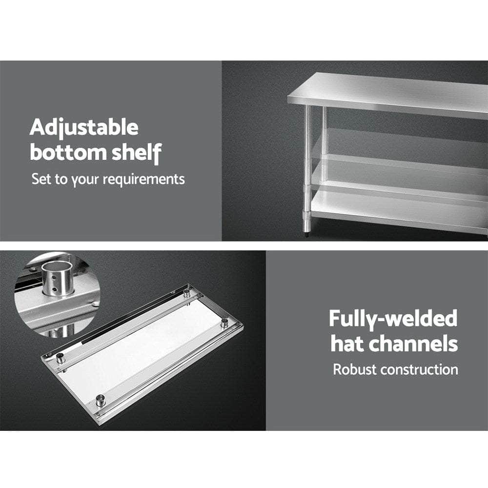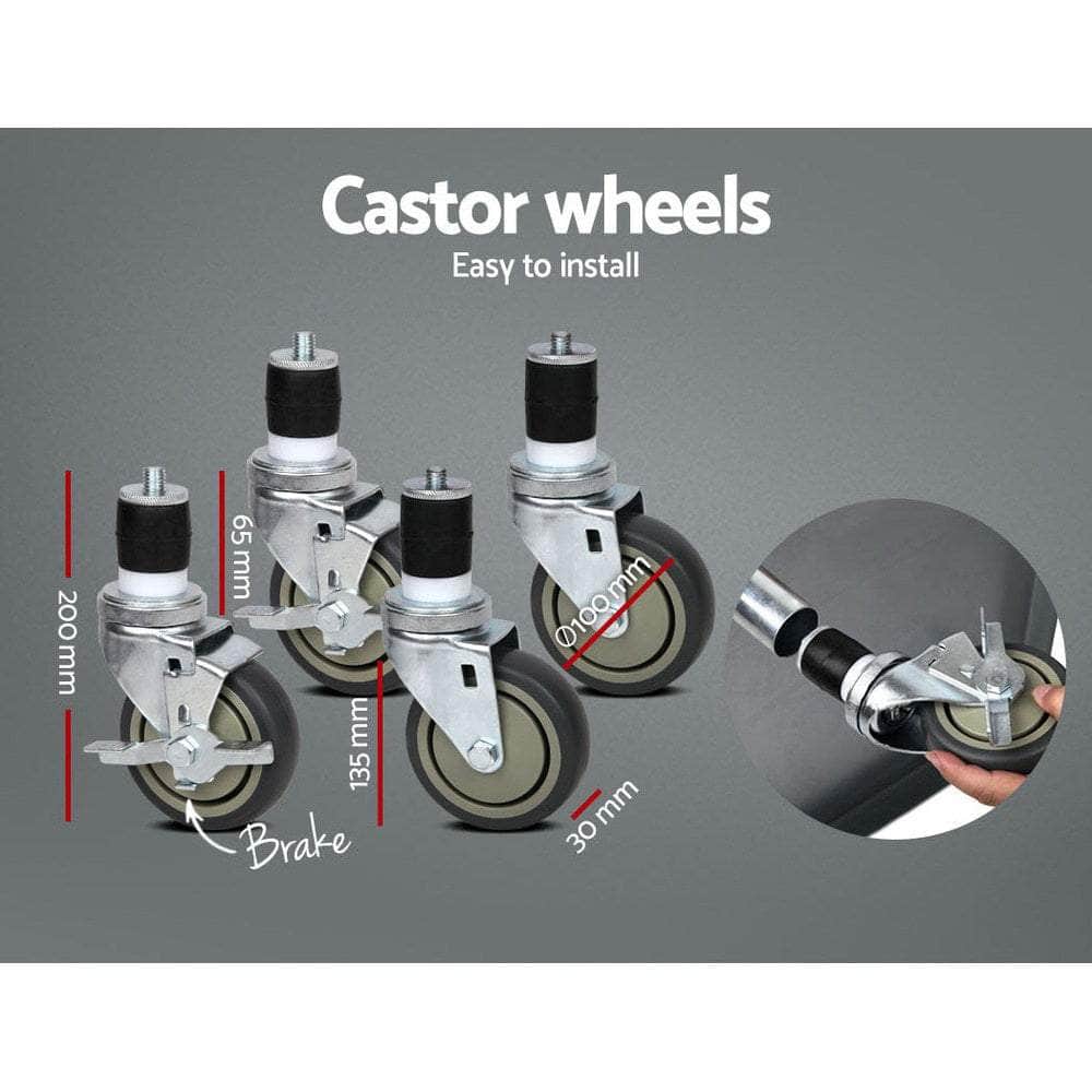 The 'Easy To Use 1219x610mm Stainless Steel Kitchen Bench with Wheels' by SIMPLE DEALS is a versatile addition to any kitchen space. This durable and spacious bench is crafted from high-quality stainless steel, making it easy to clean and maintain. The convenient wheels allow for easy mobility, making it ideal for both residential and commercial kitchens. This kitchen bench is perfect for food preparation and serving, with a generous size of 1219x610mm. Enhance your kitchen functionality with this sleek and practical piece of furniture. Upgrade your kitchen with this top-quality Kitchen Bench today!Needing a bench place but can be movable to where you need it? Get a kitchen bench with wheels! It's easy to set up and convenient to wheel it to wherever you need it to be. Gives you the extra storage, utility and work space in your kitchen, don't get restraint any more. With adjustable shelf, you can place different items on it and adjust to suitable height.