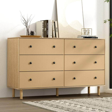 Introducing that Ruth Chest of Drawers. Made with a high-density particleboard frame for high durability and a fluted front for timeless style, the chest of drawers is designed to last. With six spacious drawers, each fitted with a smooth glide mechanism, it provides ample storage to keep your space organized and clutter-free. The pinewood legs will keep your dresser standing firmly, while anti-slip feet pads keep the piece in place and protect your floors. This chest of drawers, offering a blend of style and utility, is an unmissable addition to your furniture ensemble.