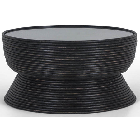 This gorgeous coffee table adds a fresh beauty to a living room. With its distinct design, round shape, black distressed colour, and glass top, the traditional style coffee table will beautify your living area. The table is designed in an exotic pattern using sustainably harvested rattan material and a metal frame. It is crafted using a unique weaving and finishing technique. Each piece is handmade from natural cane using age old traditional construction methods and so no two products are the same. Each will come with their own unique variations and look. The material ensures the table's strength, long durability, and beautiful appearance. The stunning indoor furniture will become the perfect companion for any kind of lounge or sofa, while also becoming a stopover for tea, coffee, magazines, and devices. The fully assembled coffee table comes with a one-year warranty.