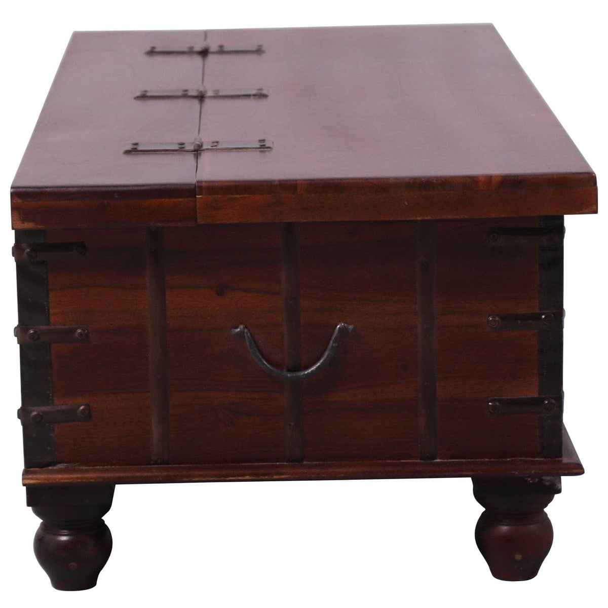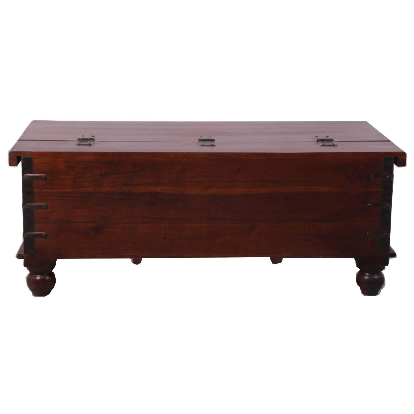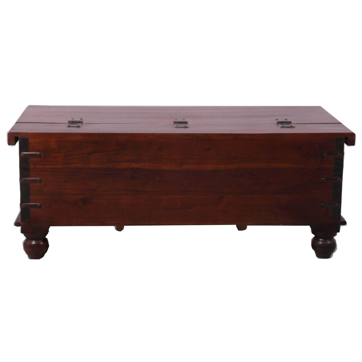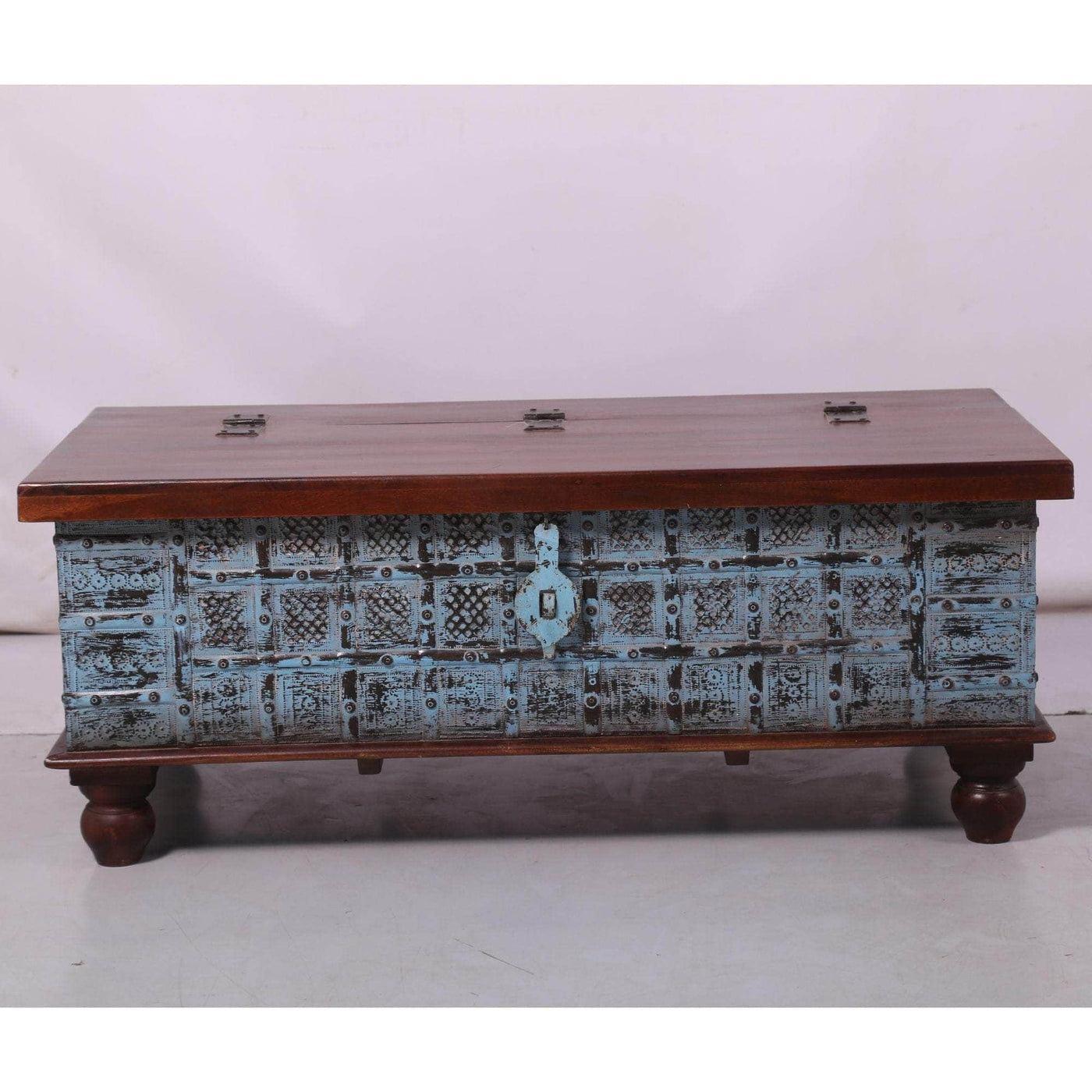 Introducing a versatile piece of furniture which is a storage trunk and also a sleek coffee table. Designed in the traditional style, it has a storage area with a hinged lid, a latch on the front and two handles on the side. The arrangement makes its movement easy. With a dark walnut finish and featuring a dynamic wood grain design, it looks so beautiful amid any interior decor setting.You may decorate it in your living area and use it as a table to keep beverage cups, devices, laptops, or even a board game. The blue painted distressed finish on the hand-crafted metal sheet of the table front adds to its antique look. The storage coffee table is made of sustainably harvested solid Mango wood with metal work on it. The wood and metalwork provide it with a robust structure and good looks. Short, scalloped legs provide the storage chest with strong support. The fully assembled storage trunk cum coffee table comes with a one-year warranty.