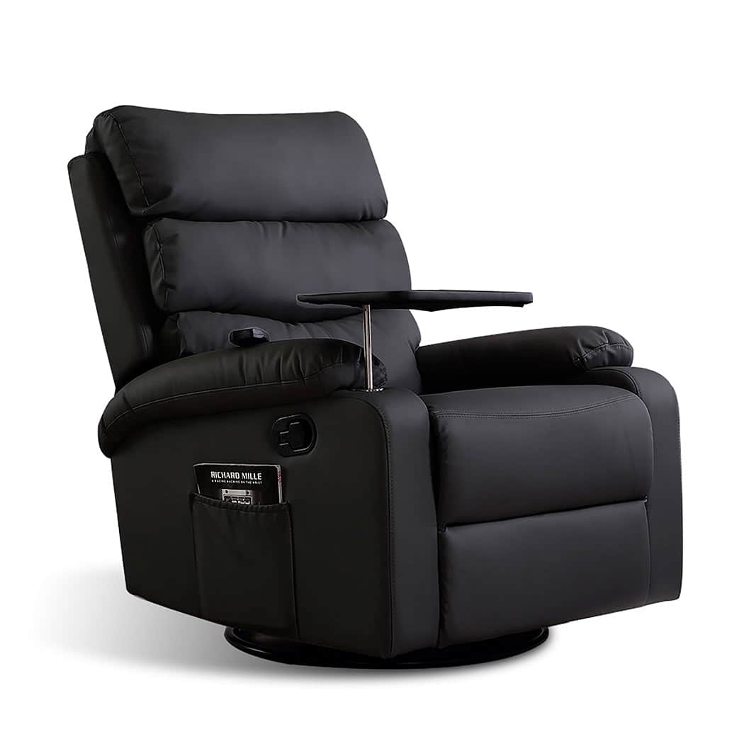 DESCRIPTION Recliner Massage Chair is designed to provide you with unique relaxing experience. Built in heated massage, helps release stress and provides soothing comfort. Helps create a breathtaking effect. Adjustable backrest and footrest with 110?-160? tilt adjustment, designed for a customized experience according to individual need. Remote controlled for convenient use. Watch your favourite movie or show as you relax on it, a removable tray is provided to hold your drinks or snacks. Ultra-wide and extra padded armrest is provided, comfortably rest your arm on it. It can easily withstand up to 150kg of weight. Wide and thick back with extra stuffing for added comfort. Very easy to clean with its sleek design. This massage chair provides a complete relaxing comfort. Just lie on it and feel the relief as stress leaves your body.