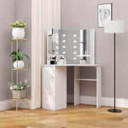 Work on your morning routine in style with our elegant vanity table! This dressing table, constructed from quality MDF, strikes a sleek and concise silhouette with a modern style. It is designed to fit snugly into a corner yet packs a lot of storage in a small amount of space! Large locker and open shelf under table offer a place for makeup items and keep everything in its place, facing sideways for easy access when seated at the table. Additionally, a beautiful 3-panel mirror provides a 3-sided view for makeup application and adds an elegant touch to the tabletop. Lower shelves are added to the two side panels for cups, makeup brushes, creams and lotions, perfumes and decorative items. The featured elegant LED bulbs illuminate your beauty as well. Note: The product has a USB connector, but the certified 5V USB power source is not included.