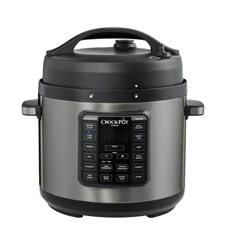 5.7 litre non-stick cooking pot 13 one-touch programs 8-in 1 versatile multi-cooker Easy release steam dial Status bar Cooks up to 70% faster Dishwasher safe Airtight locking lid Colour: Dark Stainless Steel Serving Size: 6+ people Working Capacity (L): 5.7L Wattage: 1000W Bowl Aluminium: With non-stick coating Bowl Shape: Circular Dishwasher Safe: Inner cooking pot only Oven Safe: No Controls: Digital Adjust time: Yes Delay Start: Yes Accessories: Serving spoon and steaming rack Cord Length: 90cm Safety Features: Steam release dial & airtight locking lid stays locked until pressure released