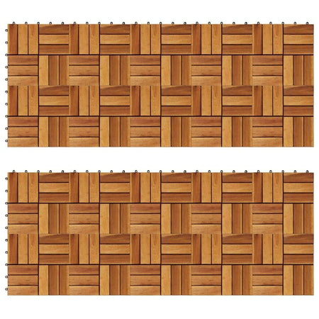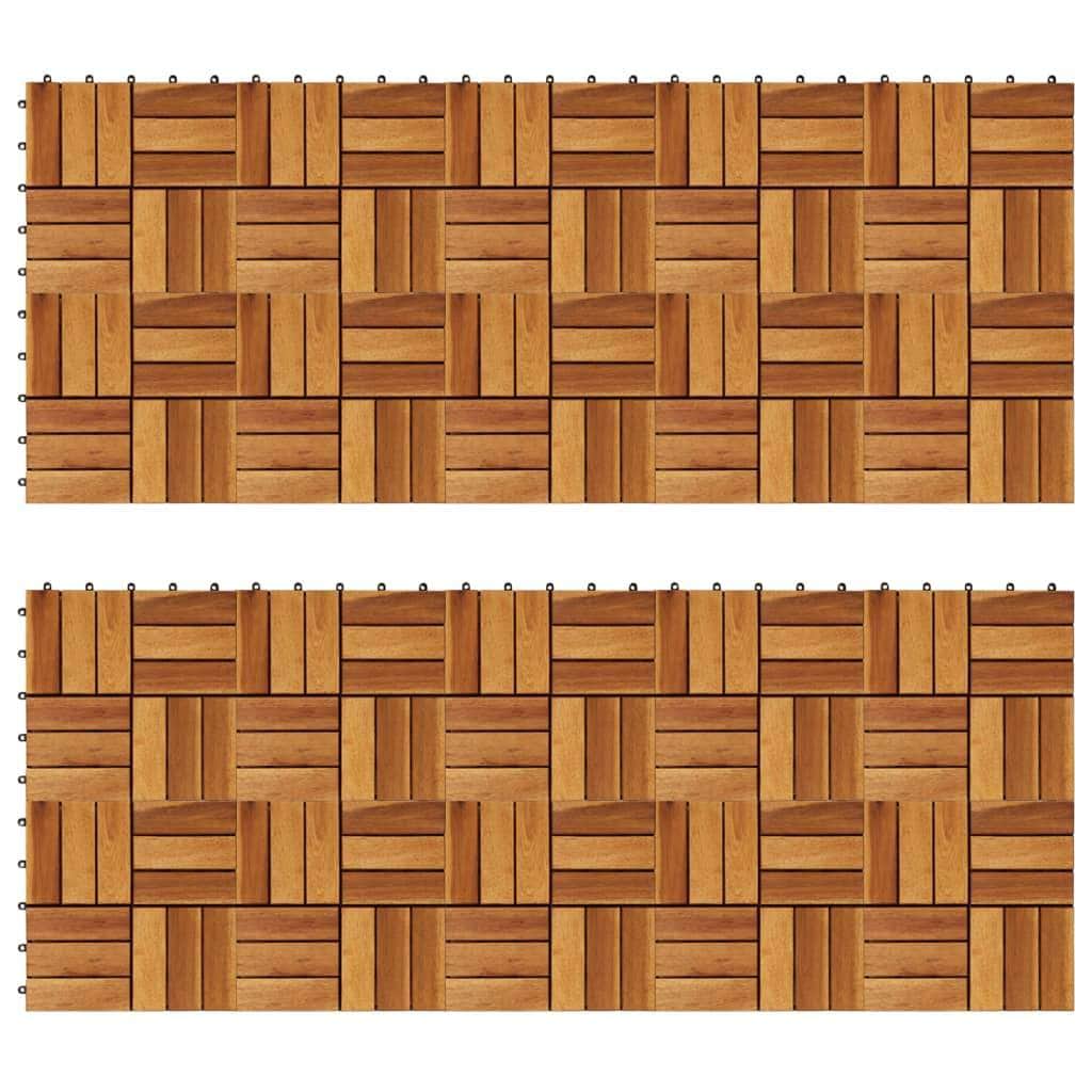 This set of 20 hardwood decking tiles will be perfect for adorning surfaces or walkways in your garden, on your terrace or balcony, or any other room. The pattern is not only decorative, but adds a non-skid quality. The decking tiles are made of high-quality acacia wood, a tropical hard wood, which of course is weather-resistant and highly durable. Thanks to their plug-in connection, the tiles can be made to interlock easily and tightly to form a stable walking surface. Delivery includes 20 wooden decking tiles.