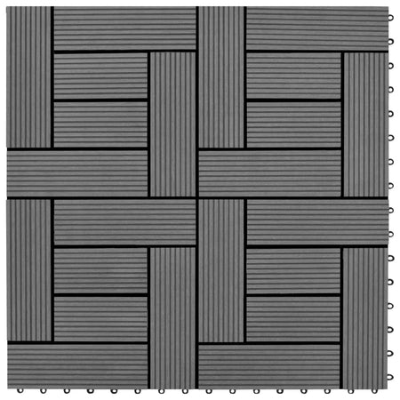 This WPC decking tile set, with an individual tile size of 30 x 30 cm, consists of 11 pieces, covering a surface area of 1 square meter. It will be perfect for patios, balconies, bathrooms, or your pool or spa area. These high-quality WPC tiles feature a quick connect interlocking system, allowing you to easily and quickly install them without the need for tools. Made of quality wood plastic composite, our tiles are water-resistant and highly durable.