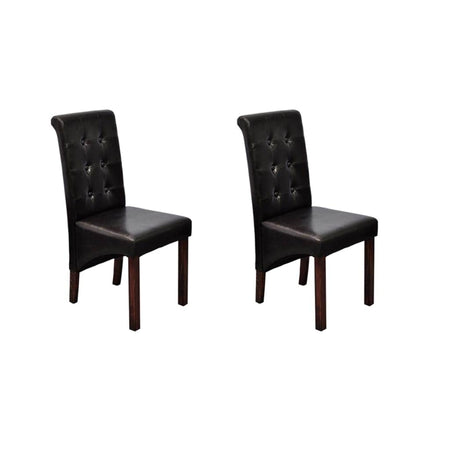 This set of 2 comfortable dining chair have ergonomically shaped seats and backrests. The chairs can easily be maintained. The seats and backrest of these dining chairs are padded with synthetic leather. The legs are made of varnished dark brown solid wood and the corners are rounded for safety.