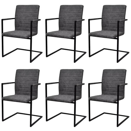 These cantilever dining chairs have a sleek, streamlined look, which suits a modern interior perfectly. They will become the focal point of your dining area at home or add a stylish touch to your office decor. The thickly foam-padded seat will offer the utmost seating comfort and great support for your back. The ribbed seat is upholstered in hardwearing and durable PU leather, which gives the dining chairs a luxurious look and feel. This dining chair set is not only lightweight but also sturdy thanks to its strong tubular steel structure. Assembly is really easy. Delivery includes 6 dining chairs.