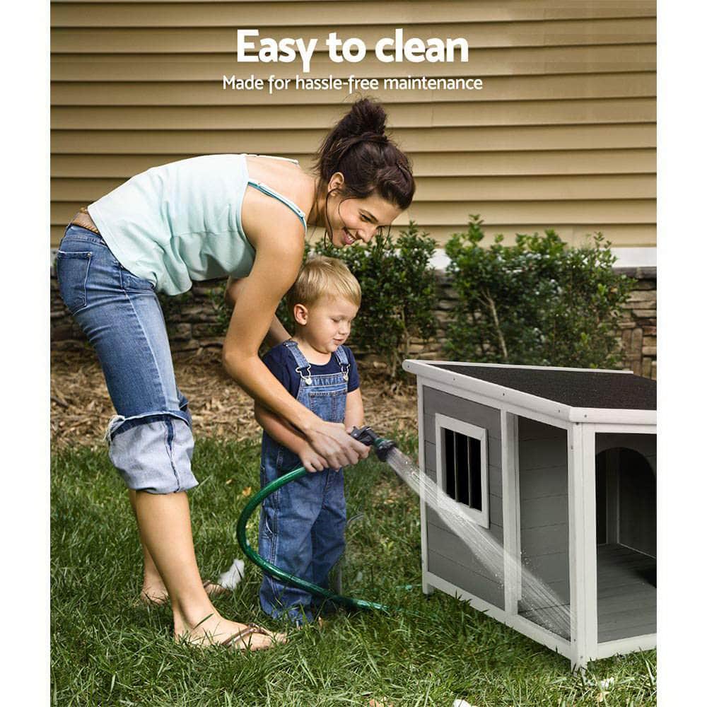 Your beloved pets deserve a safe and comfortable home to sleep, rest, and relax. Our i.Pet's Dog Kennel is just perfect for your pup. It's quite spacious, which will prevent them from feeling trapped or restricted and ensure proper ventilation. It's constructed from solid fir wood material for durability and longlasting use, and the weatherproof design with UV-resistant asphalt felt roof ensures that you pets will stay comfortable no matter how harsh the weather is. The dog kennel has a wide entrance that allows convenient entry and exit, and its elevated base with raised floor design prevents cold and dampness from breaching in and allows the liquid to flow away smoothly. It has rubber feet that ensures optimum stability and steadiness. With our easy-to-understand assembly manual, installing the dog kennel becomes an easy task, and its convenient design makes it easy to clean. Our dog kennel is suitable for both indoor and outdoor use. Place it anywhere. Bring this dog kennel today. Your pet will love and cherish it always.