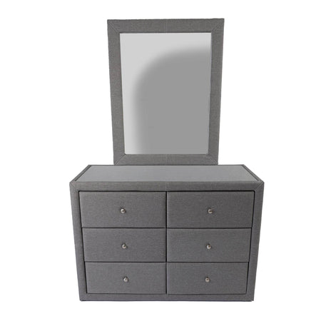 A dresser-mirror set improves the beauty of a bedroom. Here is a lovely dresser-mirror set that includes a visually appealing mirror and a 6-drawer dresser. The set is made of sustainably harvested particleboard, plywood, and the best quality annealed glass, which provides the mirror with great durability and strength. The dresser has a lot of storage space to help you keep the room clean and organised. The dresser and mirror frame are beautifully upholstered in 100% polyester fabric and have full-extension metal runners. To complement the design, the dresser features tempered glass top. The set is designed in a classic style to add a charming look to the bedroom. The entire set is finished in a light grey colour that complements almost any decor style. The dresser-mirror set is easy to assemble and comes with a one-year warranty.