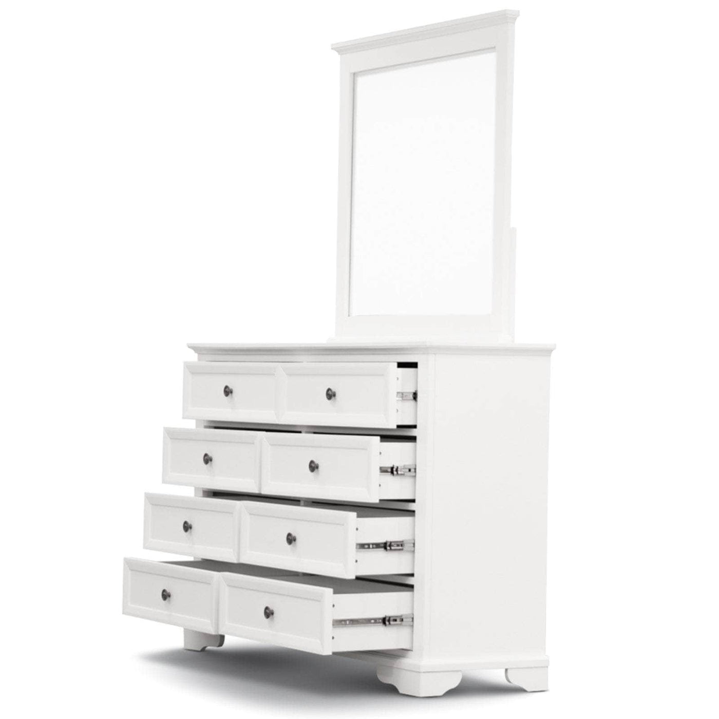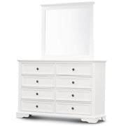 A nicely-crafted dresser-mirror set gives a new dimension to the beauty of the bedroom. Decorate your personal space with this beautiful dresser-mirror set, designed in the coastal style, and see the positive change in its looks. The dresser has 8 sizable drawers that solves the storage space issue in the bedroom. All its drawers have full metal extension runners and shiny black metal knobs.The top drawers have black felt for storing delicate items. The mirror is composed of top-quality annealed glass fitted into an equally beautiful wooden frame. The set is made of sustainably harvested solid acacia timber. The wood is known for its good looks, strength, shock-resistance, durability, and ease of maintenance. The dresser-mirror set in a white painted finish goes well with a variety of interior decor styles, and a one-year warranty is included with the fully-assembled set.