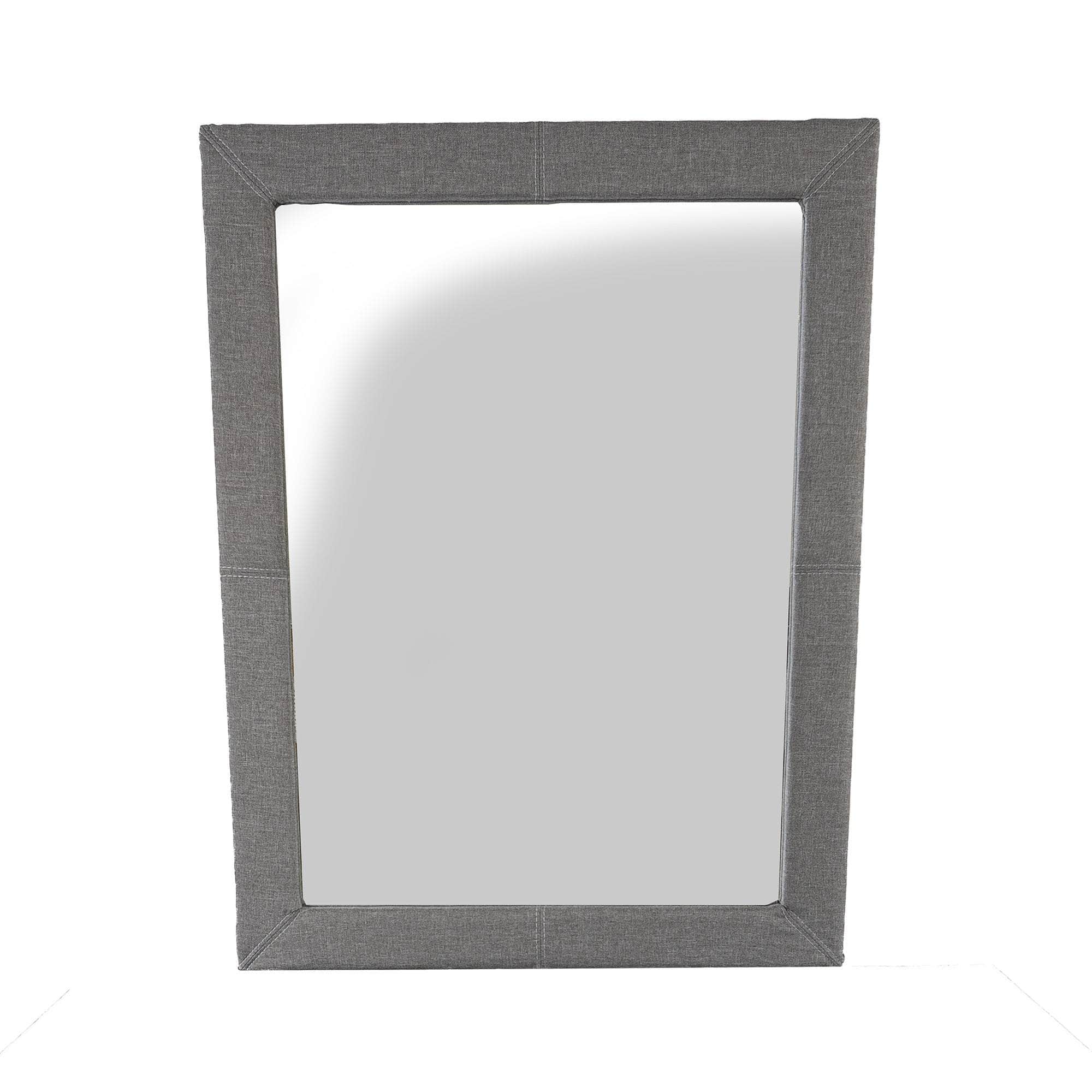 A mirror improves the beauty of a bedroom. Here is a lovely mirror with a frame made of sustainably harvested particleboard, plywood, and the best quality annealed glass that provides the mirror with great durability and strength. The mirror frame is beautifully upholstered in 100% polyester fabric. The furniture piece is designed in the classic style to add a charming look to the bedroom. The mirror is finished in a light grey colour that complements almost any decor style. The fully assembled mirror with a one-year warranty.