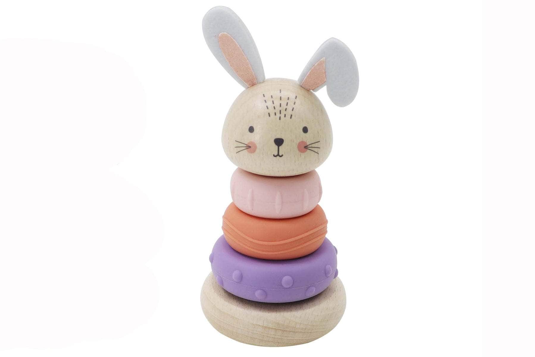 Introducing the EcoStack Bunny Rings, a charming and eco friendly stacking toy that combines sustainable materials with engaging play. Crafted from durable beech wood, this toy features a sturdy base adorned with a friendly bunny head, inviting little ones into a world of tactile exploration.The set includes a variety of rings made from both smooth wooden and soft silicone materials. Each ring offers unique textures that captivate young fingers and stimulate sensory development. The contrasting materials provide opportunities for sensory exploration and fine motor skill refinement as children grasp, stack, and manipulate the rings.Maintaining the EcoStack Bunny Rings is simple and effortless, just wipe down the rings with a damp cloth to keep them clean and ready for playtime. Avoiding alcohol based cleaners ensures the longevity and natural appeal of the wood and silicone components.Ideal for both solo and interactive play, this toy encourages cognitive development through sorting and stacking activities. It fosters creativity, problem solving skills, and spatial awareness in a fun and educational manner.Choose the EcoStack Bunny Rings for a sustainable and enriching addition to your childs toy collection. With its thoughtful design and eco conscious materials, it promises hours of imaginative play and developmental benefits.