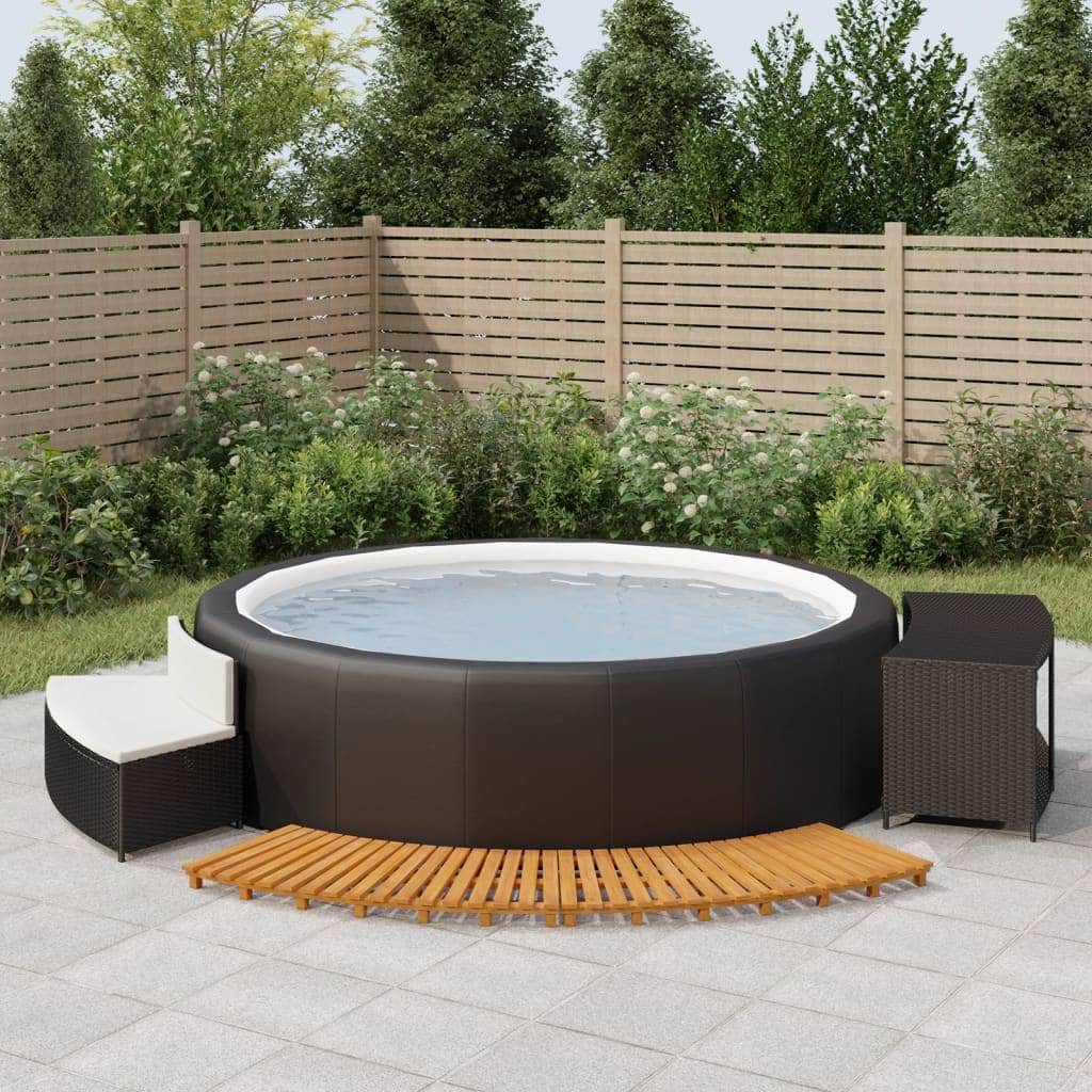 Enhance the spa experience for you and your guests with this stylish hot tub surround. Durable material: PE rattan, also known as poly rattan, is weather resistant and easy to clean. It remains beautiful on the outside for a long period of time. It's more economical than other materials, while offering great quality, convenience and an aesthetic look.Stable frame: The bench and storage shelf's frames are made of powder-coated steel. Steel is an exceptionally hard and strong material. It offers sturdiness and stability. The powder coating on steel creates a protective layer against wear and tear.Solid acacia wood: The spa step is made of solid acacia wood. Solid acacia wood is a beautiful natural material. Acacia wood is a tropical hardwood, which is dense, sturdy, and durable.Comfortable experience: The hot tub surround includes a spa bench with cushions for maximum relaxing comfort.Storage space: Featuring a built-in storage area, the hot tub enclosure keeps all the essentials organised and within easy reach.