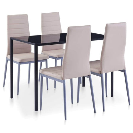 This dining table set, consisting of 5 pieces, has a sleek, modern design and is perfect for those who are looking to add a touch of style to their interior. The table top is made of high-strength tempered glass which is easy to clean. Each chair is upholstered with quality faux leather. The supple, padded seat is very comfortable. Delivery includes 1 table and 4 chairs.