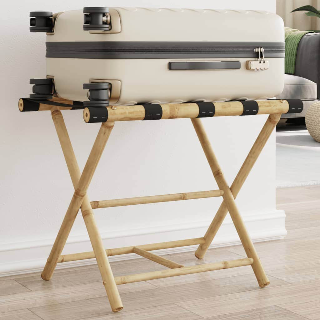 This luggage rack is the perfect helper to pack, unpack and store your suitcase. Durable material: Bamboo is known for its flexibility and hardness. Bamboo furniture is a good option when you want sturdy furniture made from natural materials.Ample storage space: The suitcase stand has two shelves. The upper shelf consists of 5 sturdy straps and is large enough to hold larger suitcases and the lower shelf is ideal for shoes or hand luggage.Foldable: The luggage holder can be easily folded up for saving space when not in use.