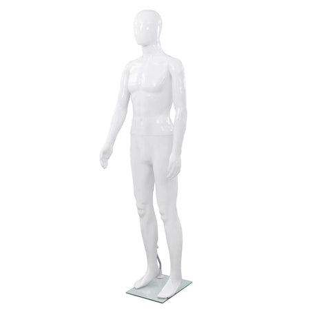 This full-body male mannequin with a glass base and a high-gloss paint finish can be used to display clothes, wigs or shoes in shop windows. The mannequin consists of 5 parts: head, torso, legs, left arm, and right arm. The head and the arms can be rotated 360°, which allows you to arrange the mannequin in a variety of different positions. The whole body is made of polypropylene, which is lightweight and durable. The glass base with aluminium stand ensures stability and allows the model to display shoes. Assembly is easy.
