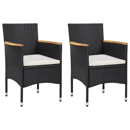 Add a hint of modern style with our poly rattan chair set. Capable of completing an outdoor dining set or standing out on their own, this chair set will make a statement in any setting. Sturdy steel frame wrapped with weather resistant hand woven PE rattan, this chair set is rust and mildew proof, which can provide years of quality relaxation. Designed with curved backrest and armrest, this set has a more ergonomic shape for maximum comfort. The armrests are decorated with acacia wood, which brings a touch of rustic charm. Cushions are included for added support and the zipped cover is removable for easy washing. Delivery includes 2 chairs.