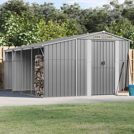 Expand your outdoor storage possibilities and protect your tools with this multifunctional garden shed. Robust material: The garden tool shed is made of galvanised steel, which prevents rusting and endures long-time use. Steel is an exceptionally hard and strong material. It offers sturdiness and stability. Galvanisation provides better protection against corrosion and is useful for products that'll be used outdoors as well as in harsh environments.Ample storage space: This metal shed with a firewood stand provides ample space to store your firewood, garden tools, furniture, equipment, and more.Convenient handles: The storage shed features handles on the door for easy entry.Good ventilation: The outdoor shed is equipped with 4 air vents, providing ventilation to reduce the accumulation of moisture and odour in the house.Sloping design: The sloping roof ensures unimpeded drainage of water.