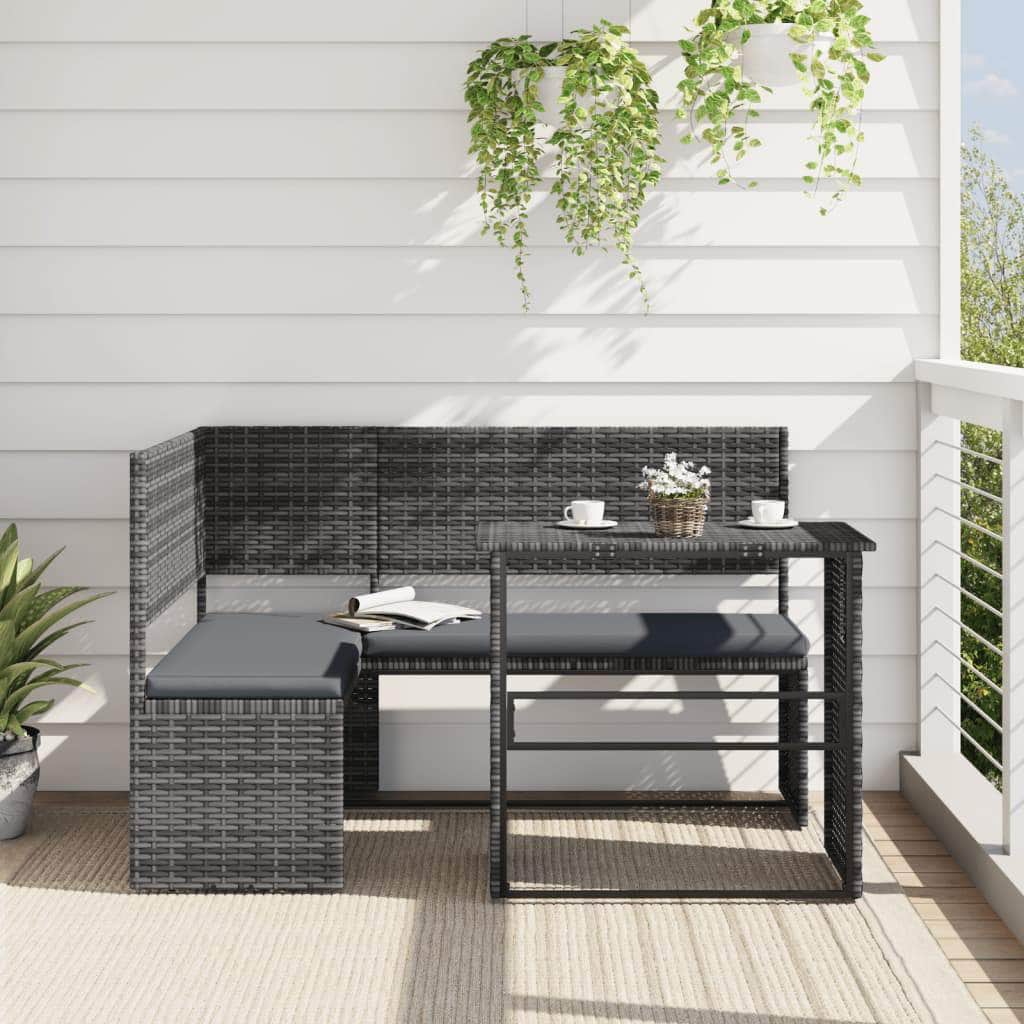 This L-shaped garden sofa is the perfect addition to your garden, terrace, or patio, providing a comfortable and inviting space for chatting with family and friends or simply relaxing and enjoying the outdoors. Durable material: PE rattan, also known as poly rattan, is a strong, low-maintenance synthetic material that looks like natural rattan. It's lightweight, easy to clean, and commonly used for outdoor furniture due to its durability and weather-resistant properties.Comfortable seat experience: This outdoor furniture, complete with thickly padded cushions, offers a comfortable seating experience.Robust and stable frame: The powder-coated steel frame ensures the garden furniture is strong and stable for daily outdoor use.Foldable design: This garden table can be folded to save space when not in use. Good to know:To make sure your outdoor furniture stays beautiful, we recommend protecting it with a waterproof cover.