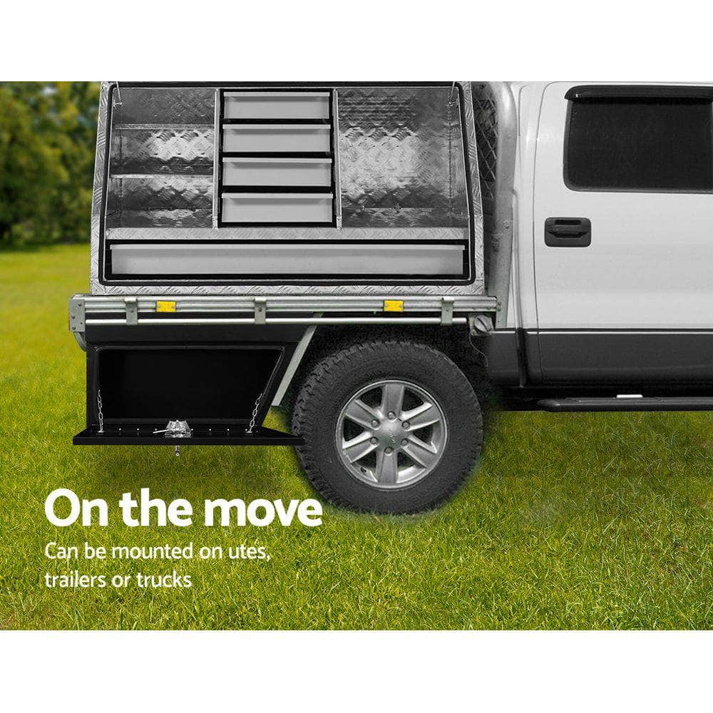 For reliable and safe tool storage, nothing beats our Giantz Undertray Toolbox, designed to fit under the ute tray beside the wheel guard. Coming in a left and right pair to fit on each side your vehicle, the toolbox is made of heavy-duty steel with powder-coated finish and durably constructed to withstand robust use. The high-quality rubber sealing and fully welded seams also help to keep your precious equipment and tools clean and dry from the weather elements. Better still, the front-opening lid with stainless steel piano hinges ensures easy access and storage of your tools with minimum hassle, and the chain stays provide durable lid support to keep it open at a 90 ° angle. Not least, the toolbox is equipped with a heavy-duty T-handle lock with two keys for added security at all times. Best of all, with our toolbox installed under your ute, you can free up the space on your ute tray and still take your tools wherever they are needed.